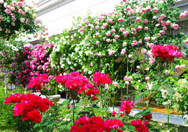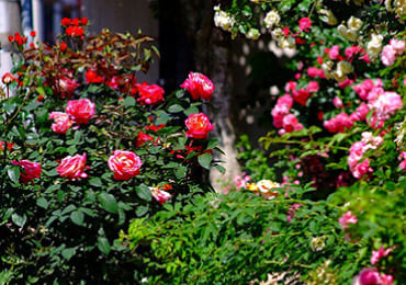 見頃は薔薇の咲き誇る5月。その他の時期にもクリスマスローズや水仙といった数々の花が楽しめます。