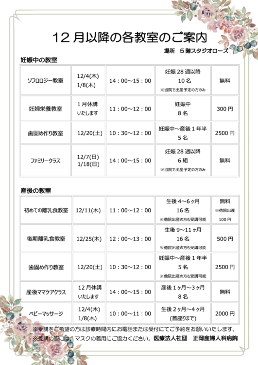 12月以降 妊婦教室・赤ちゃん教室のご案内