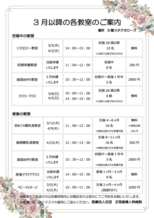 3月以降の妊婦教室・赤ちゃん教室について、お知らせします。
