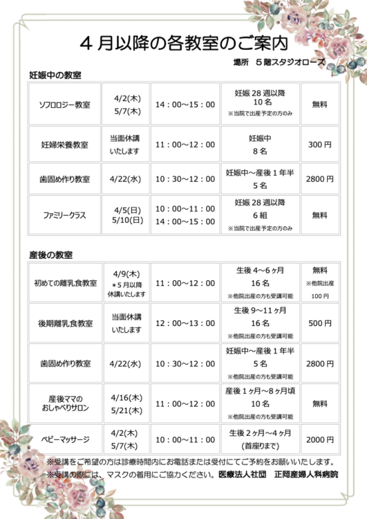 4月以降 妊婦教室・赤ちゃん教室のご案内